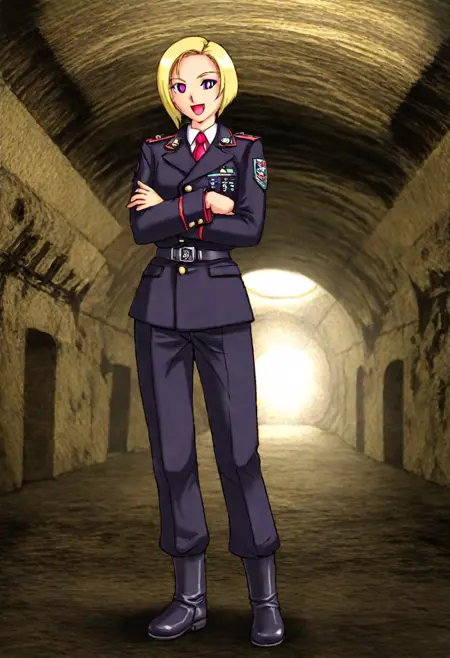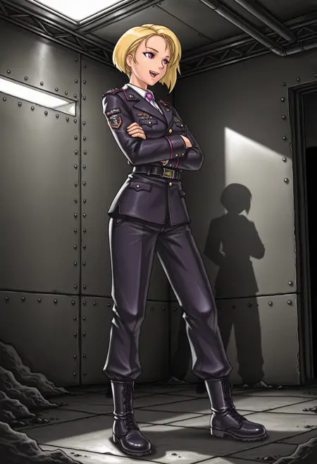 粒子炮女仆前来指挥骑兵部队。主要提示为“AlexanderZH”,发型/服装包括“短发、金发、军装、勋章、领带、长裤”。