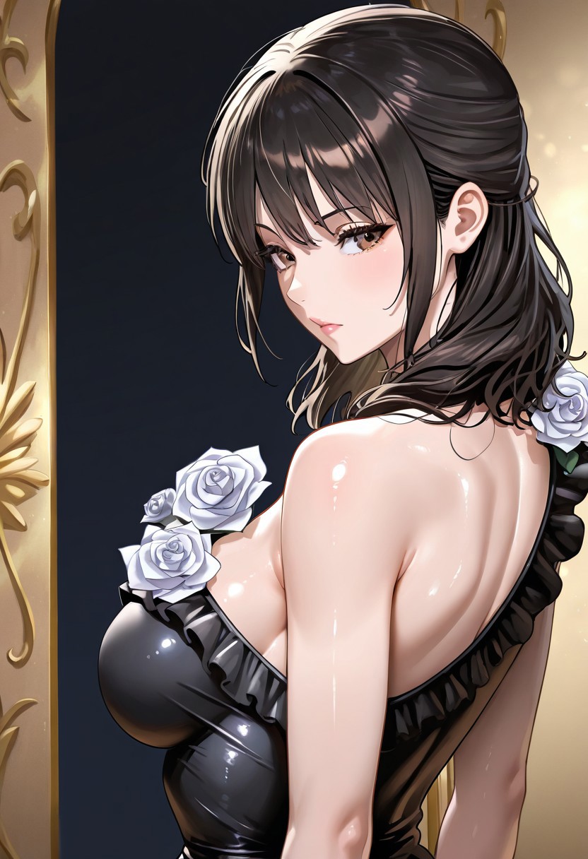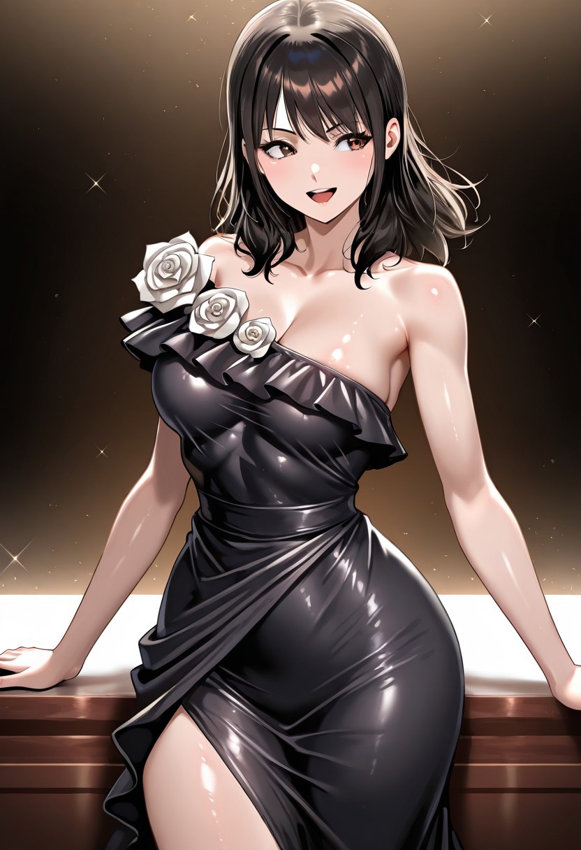 shiina_alisa, alisa_b002,1girl,solo, medium hair, brown eyes, black hair, flower, rose, breasts, bangs, bare shoulders, one shoulder dress, strapless dress, black dress,