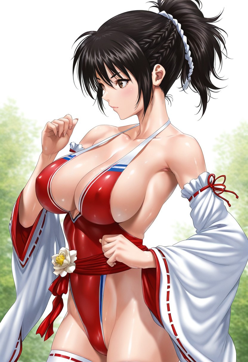 shiina_alisa, alisa_c003,1girl,solo ,breasts, ponytail, brown eyes, black hair, cleavage, sleeveless, leotard, detached sleeves, wide sleeves, thighhighs, sideboob,