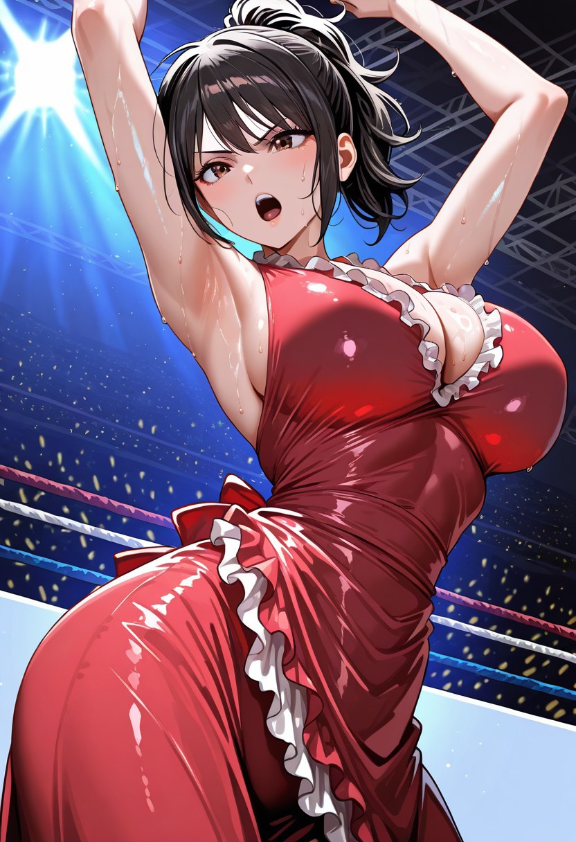 shiina_alisa, alisa_a001,1girl,solo, ponytail, brown eyes, black hair, red dress, breasts, cleavage, sleeveless, sleeveless dress, frills, frilled dress,