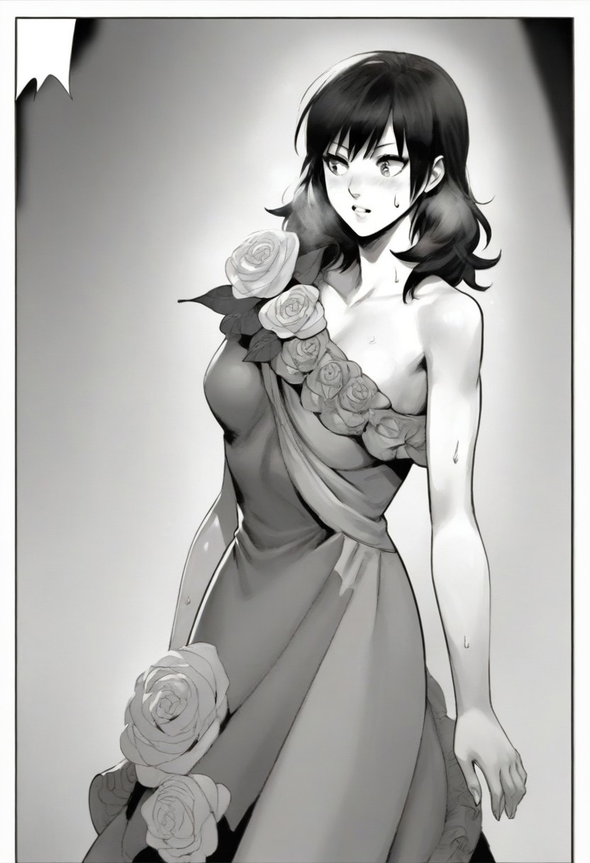 shiina_alisa, alisa_b002,1girl,solo, medium hair, brown eyes, black hair, flower, rose, breasts, bangs, bare shoulders, one shoulder dress, strapless dress, black dress,