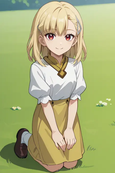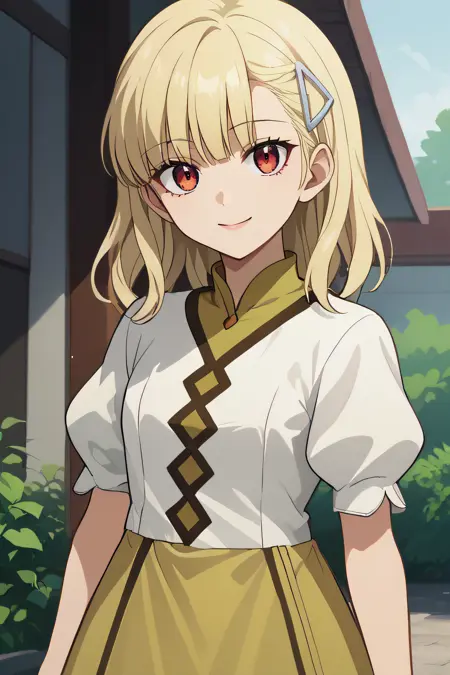 white shirt, yellow undershirt, short sleeves, puffy sleeves, yellow skirt