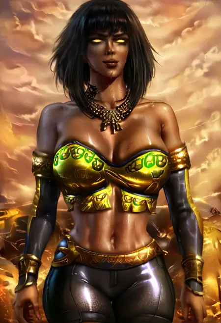 Tanya MKX, 1girl, solo, breasts, black hair, navel, jewelry, yellow eyes, midriff, dark skin, necklace, glowing eyes, no pupils, top, pants, armband