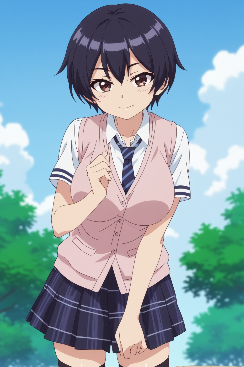 Triggers : aki kokonoe,short hair,brown eyes,short hair,school uniform,shirt,sweater vest,thighhighs,necktie,skirt