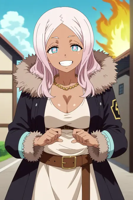 Triggerq: ヒバナ、濃い肌、長い髪、笑顔、歯、濃い肌の女性、シンボル形の瞳、ジュエリー、胸、胸元、大きな胸、黒い毛皮のトリム、胸元、黒いコート、ベルト、白いドレス、ジュエリー、ネックレス、開いたコート