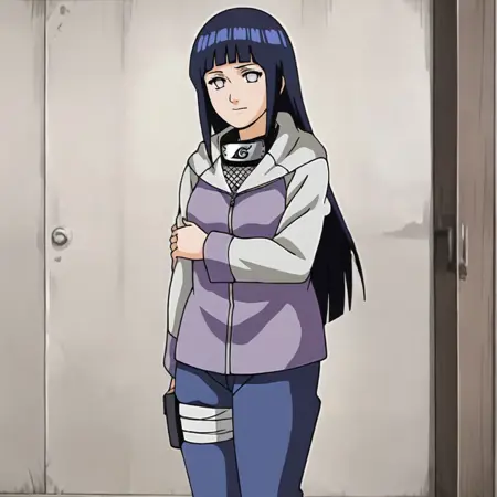 触发词:Hinata, hyuuga hinata, 1girl, 长发, 黑发, 木叶村标志, 长袖, 白眼, 额护具, 齐刘海, 带帽兜, 夹克, 拖鞋, 裤子, 牛仔镜头
