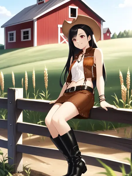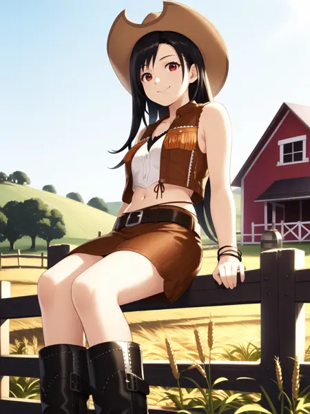 Cowgirl prompts :  1girl, tifacogi, black hair, long hair, bangs, red eyes, cowboy hat, brown cropped vest, sleeveless, bare shoulders, belt, bracelet, brown skirt, midriff, navel, black boots