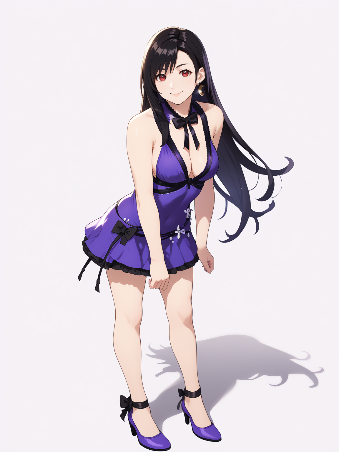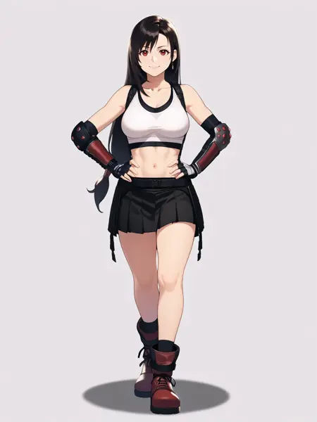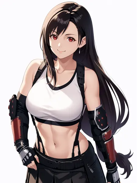 Default outfit prompts : 1girl, tifa lockhart, black hair, low-tied long hair, red eyes, bangs, white tank top, sports bra, belt, pleated skirt, fingerless gloves, elbow pads, large breasts, midriff, navel, suspender, midriff, navel,suspender, zettai ryouiki, boots