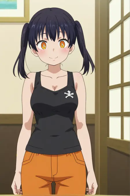 トリガー: 玉木コタツ、オレンジ色のジャケット、笑顔、ほほえみ、長い髪、ツインテール、胸、開いた服、黒のタンクトップ