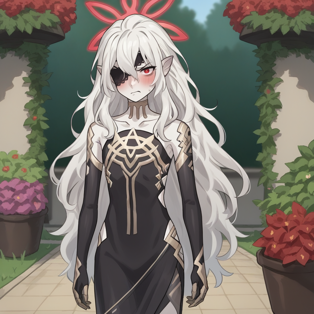 옵션: 빨간 눈, 긴 머리, 뾰족한 귀, 하얀 머리, 색이 있는 피부, 환상, 눈알 보호대, 하이힐, 검은 드레스, 팔꿈치 장갑,