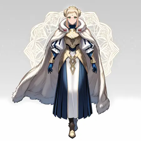 옵션: 머리 땋은 헤어, 녹색 눈, 금발, 드레스, 모피 망토, 파란 장갑, 모피 테두리, 갑옷