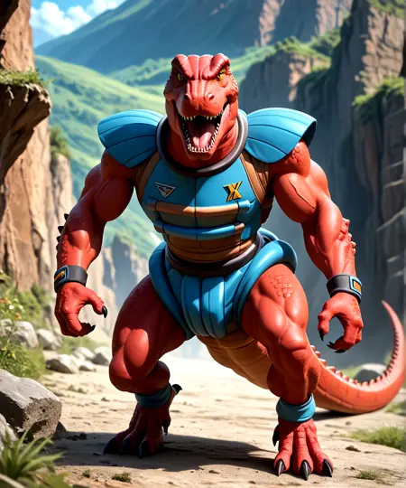 이 모델의 프롬프트는 Genghis Rex, Dinosaucers, 빨간 피부, 갈색 눈, 근육질, 티라노사우루스 렉스, trex, 공룡입니다.
