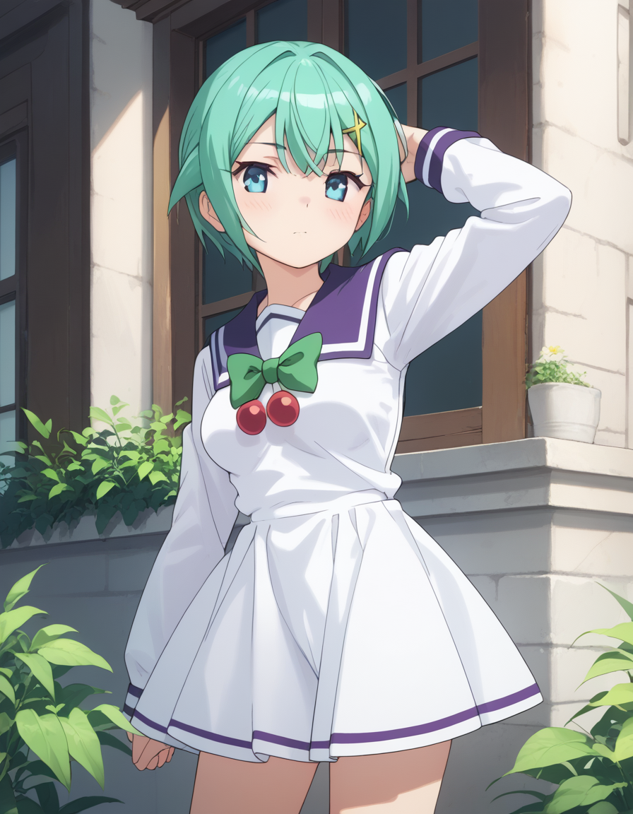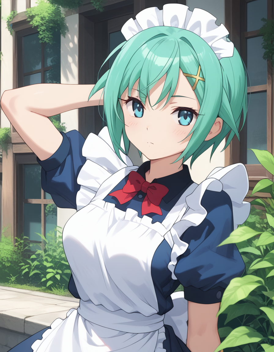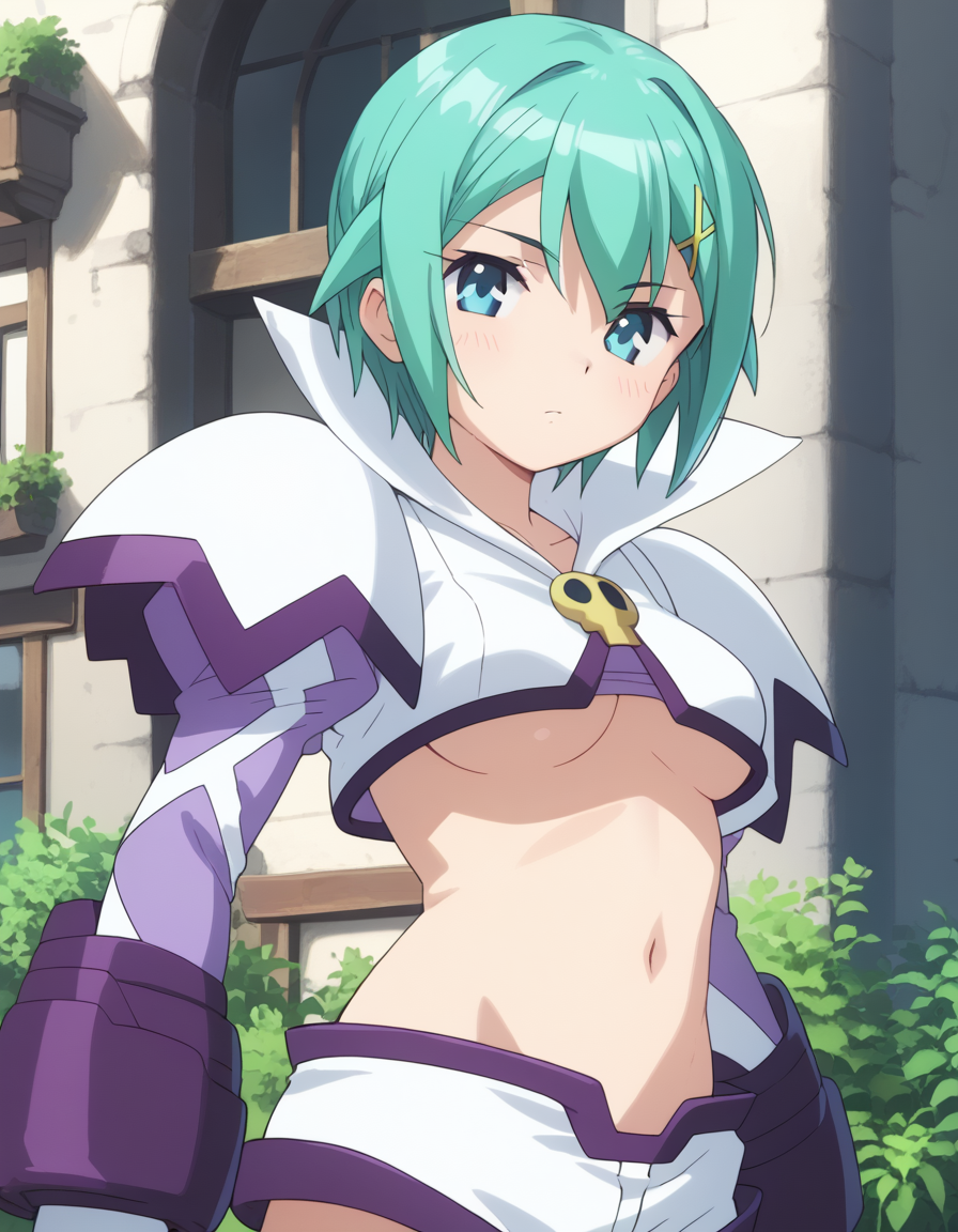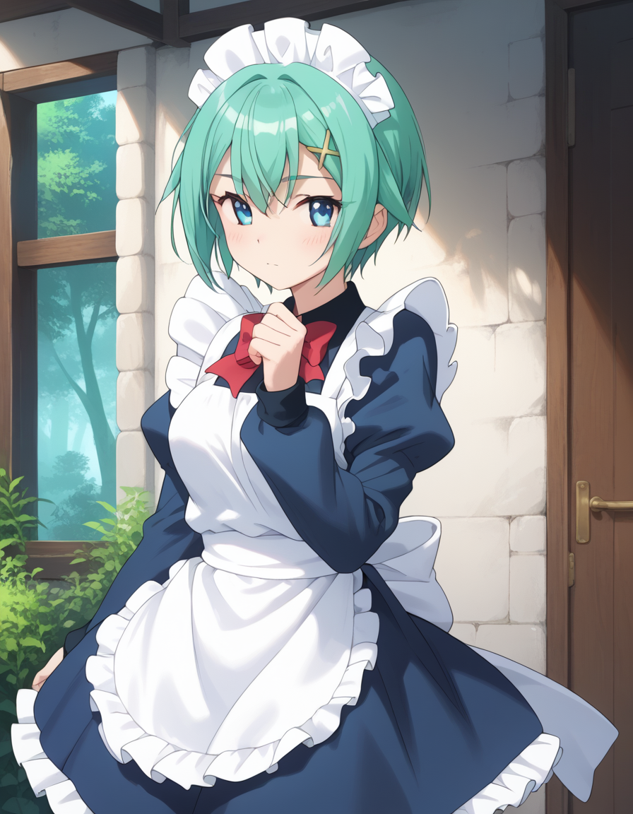 | Trained Words | nine_violet, short hair, blue eyes, green hair, aqua eyes, medium breasts, aqua hair, hair ornamentCopied! underboob, shorts, midriff, purple thighhighs, white white shorts, navel, boots, short shorts, gloves, Copied! maid headdress, maid, apronCopied! school uniform, white dress, green bow, serafuku, ribbon, Copied! sword,holding sword,weaponCopied! |