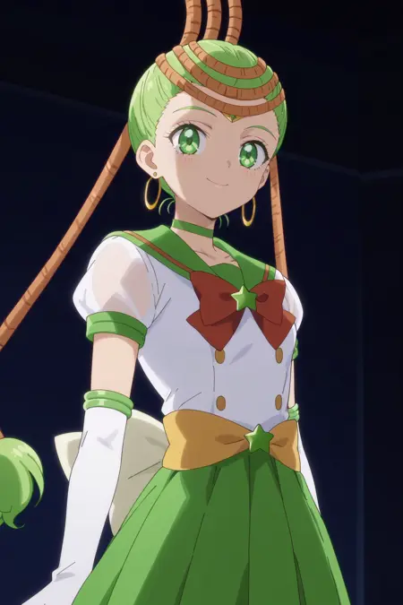 sailor senshi uniform, sailor collar, earrings, white gloves, bow, choker, back bow, elbow gloves, green skirt, pleated skirt, star brooch, circlet,