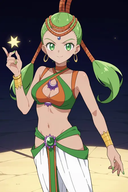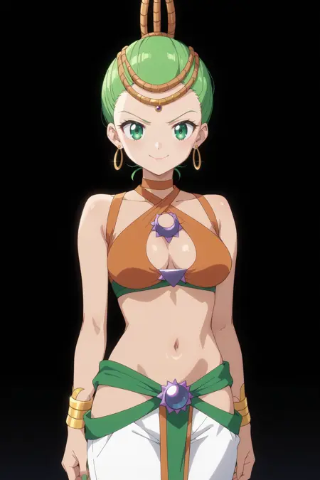 junout, jewelry, navel, earrings, midriff, cleavage, medium breasts, pants, bracelet, forehead jewel,