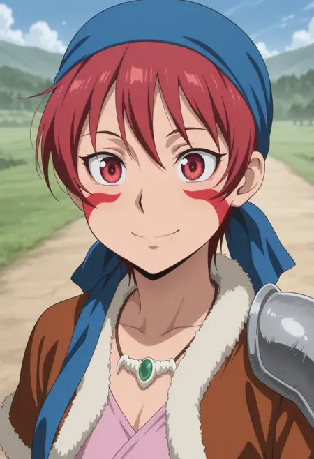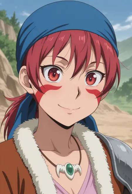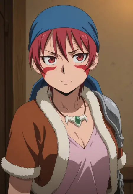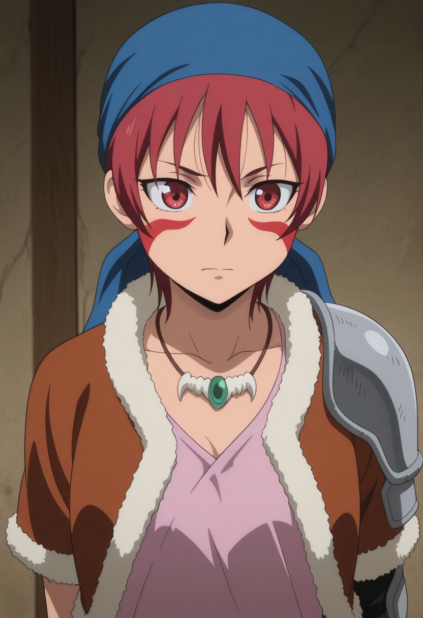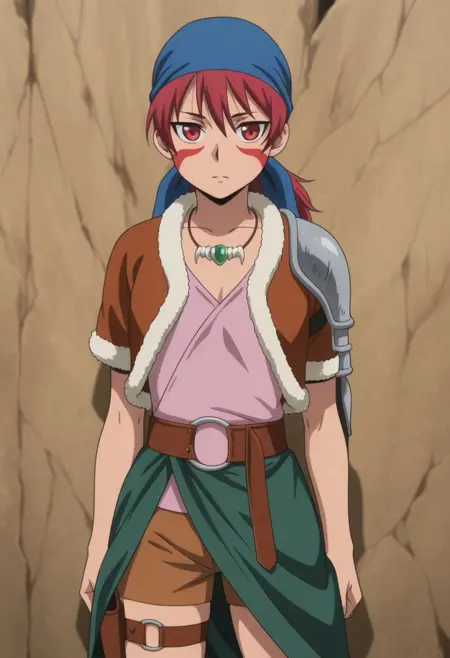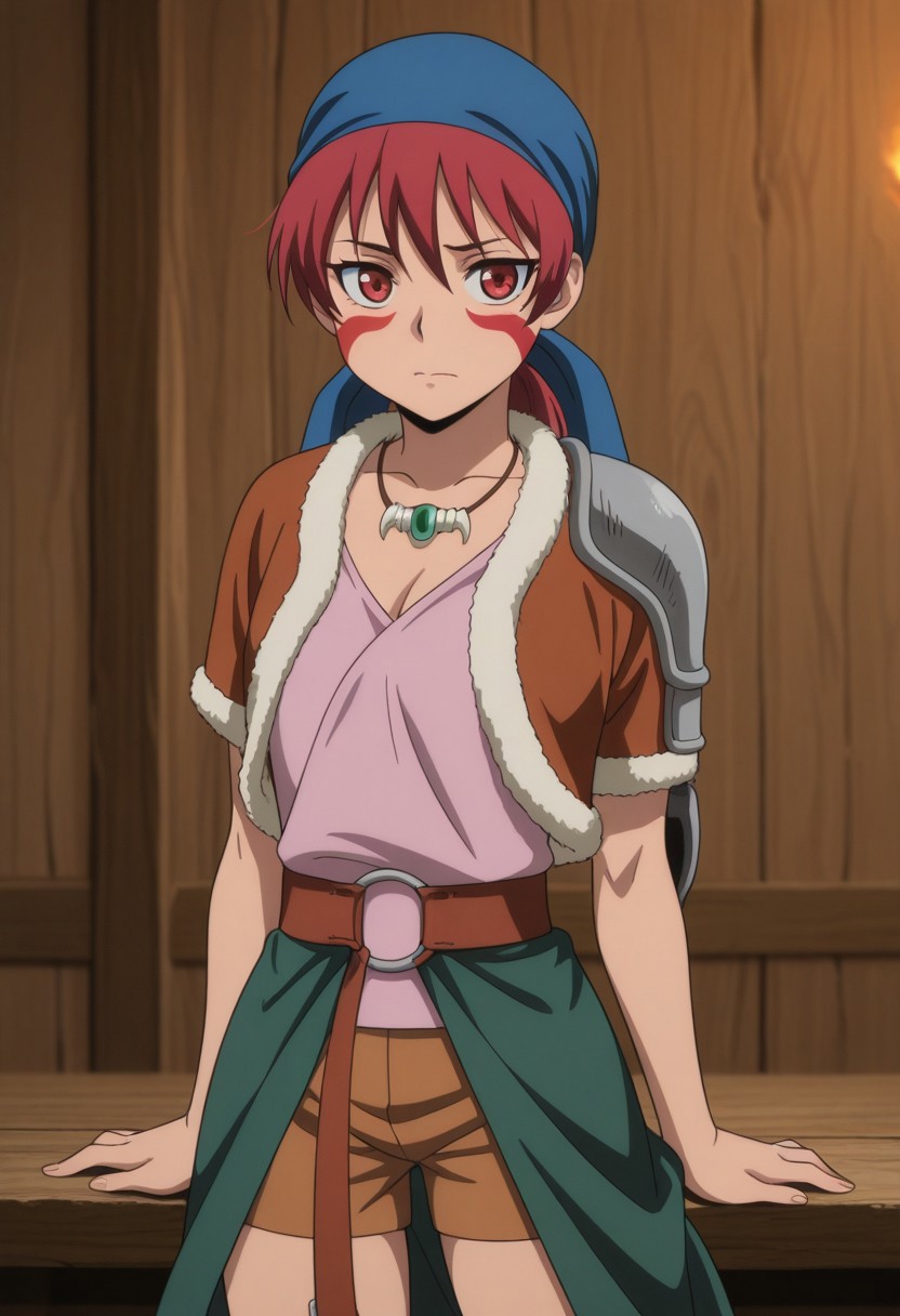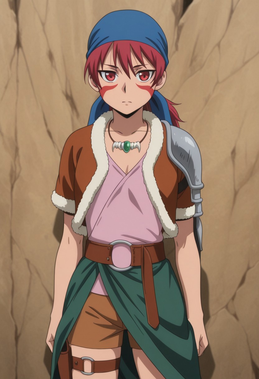 alfarid, 1girl, solo, facepaint, red eyes, red hair, blue bandana, necklace, pink shirt, brown jacket, fur trim, shoulder armor, belt, brown shorts, holster, green sarong, boots, brown footwear,