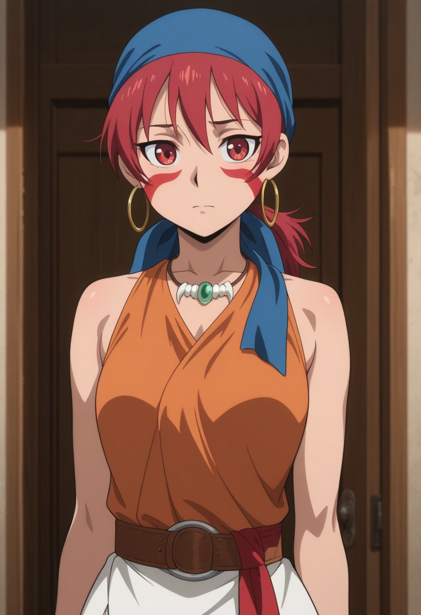 alfarid, 1girl, solo, facepaint, red eyes, red hair, blue bandana, necklace, hoop earrings, orange shirt, sleeveless, belt, red sash, white skirts, ankle boots, brown footwear