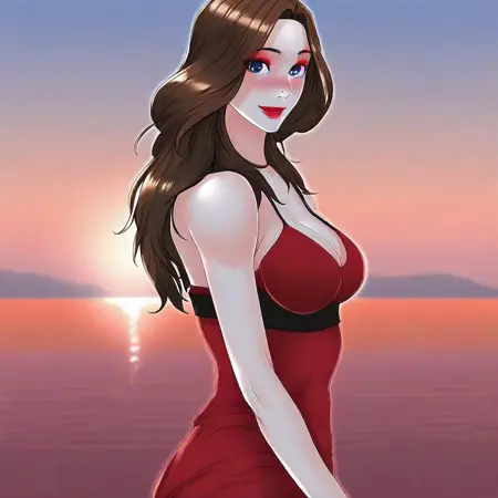 ((セクシーなカットアウトノースリーブの赤いドレス、過剰な胸元、巨大な胸元、))