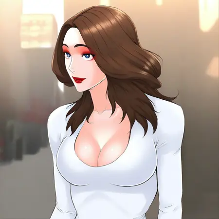 ((オープンな長いベージュのトレンチコート、セクシーな白いカミソール、過剰な胸元、巨大な胸元、青いペンシルスカート、))