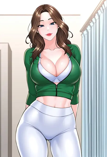 ((オープンな緑のジッパー付きスポーツパーカー、セクシーな白いスポーツブラ、過剰な胸元、巨大な胸元、お腹、セクシーな白いヨガパンツ、))