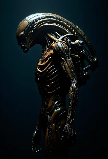我备受好评的SD1.5生物机械LoRA的高分辨率Flux Dev重制版。它比以前效果好得多,能生成一些真正恐怖的外星有机科技图像。