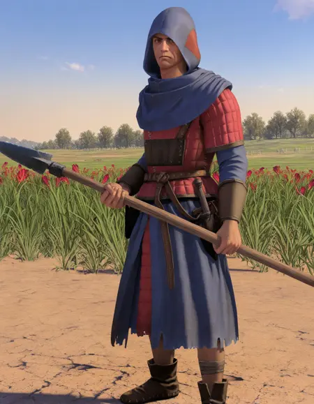 BretonnianPeasant, hood, belt, holding polearm, pitchfork,