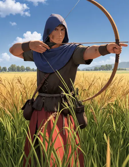 활사 버전의 경우 "holding polearm, pitchfork,"를 "bow\(weapon\)"로 교체하세요.