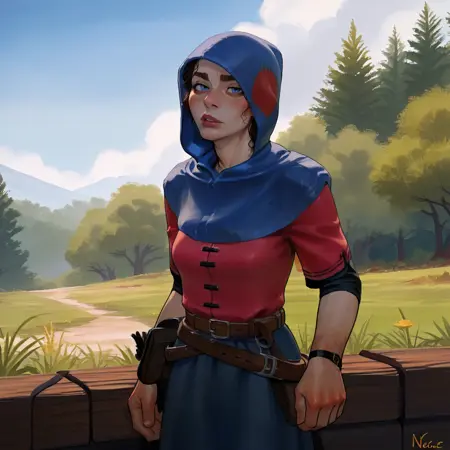 BretonnianPeasant, hood, belt, holding polearm, pitchfork,