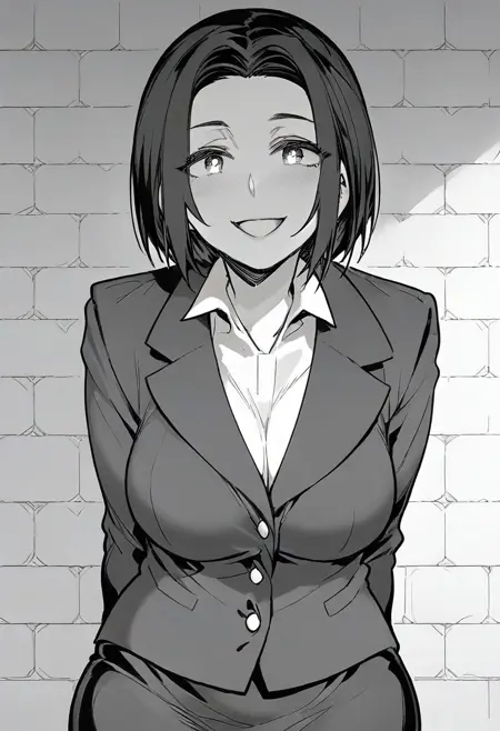 1. ((formal, dark grey suit jacket, white shirt, dark grey pencil skirt, ))