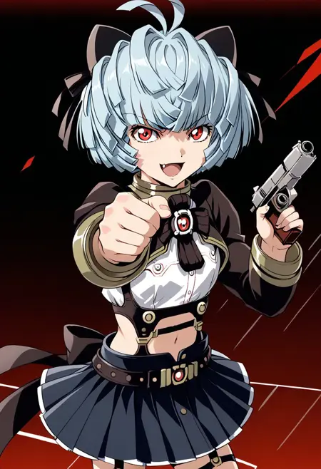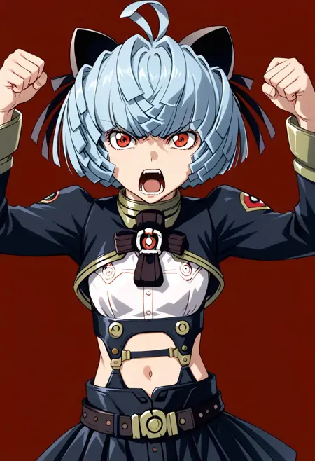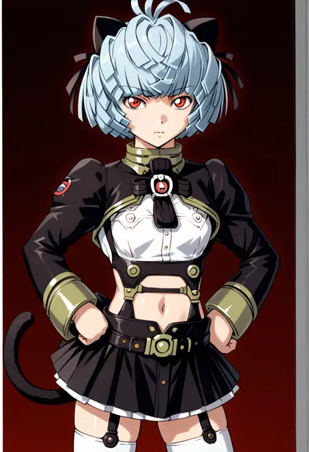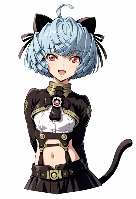 프롬프트: mobile suit gundam 00, gundam 00, hayana, red eyes, skirt, short hair, navel, black skirt, cropped jacket, ahoge, ribbon, long sleeves, blue hair, pleated skirt, hair ribbon, animal ears, midriff, smile, puffy sleeves, Garter straps, garter belt.