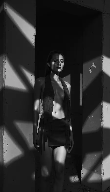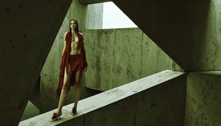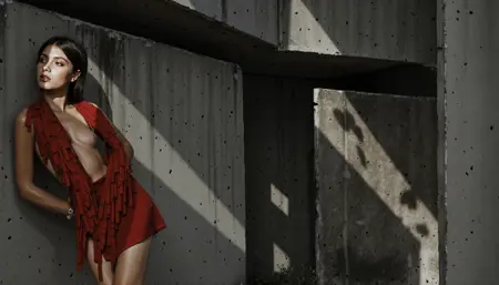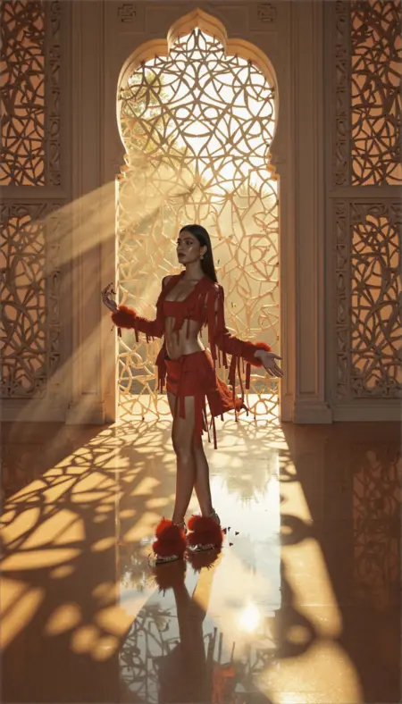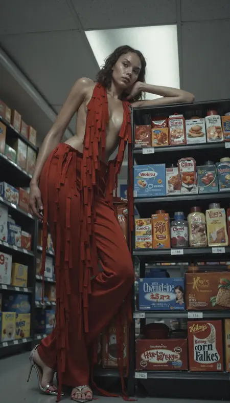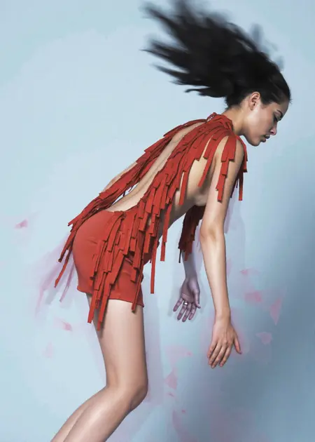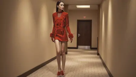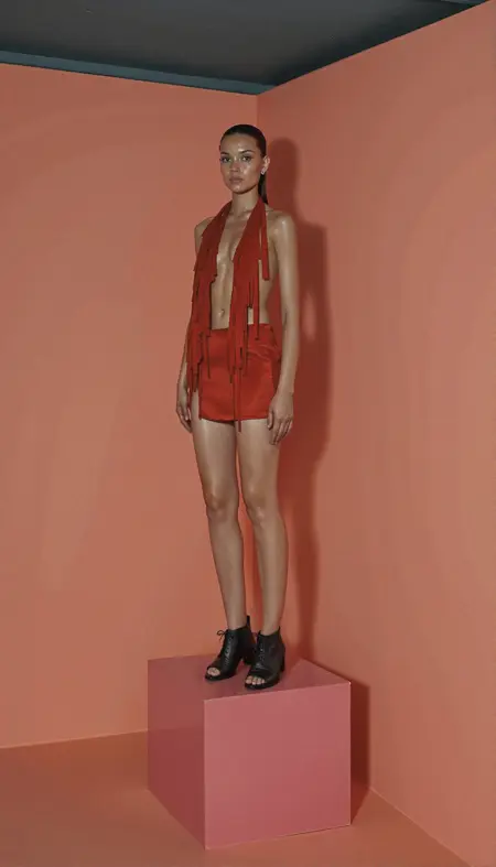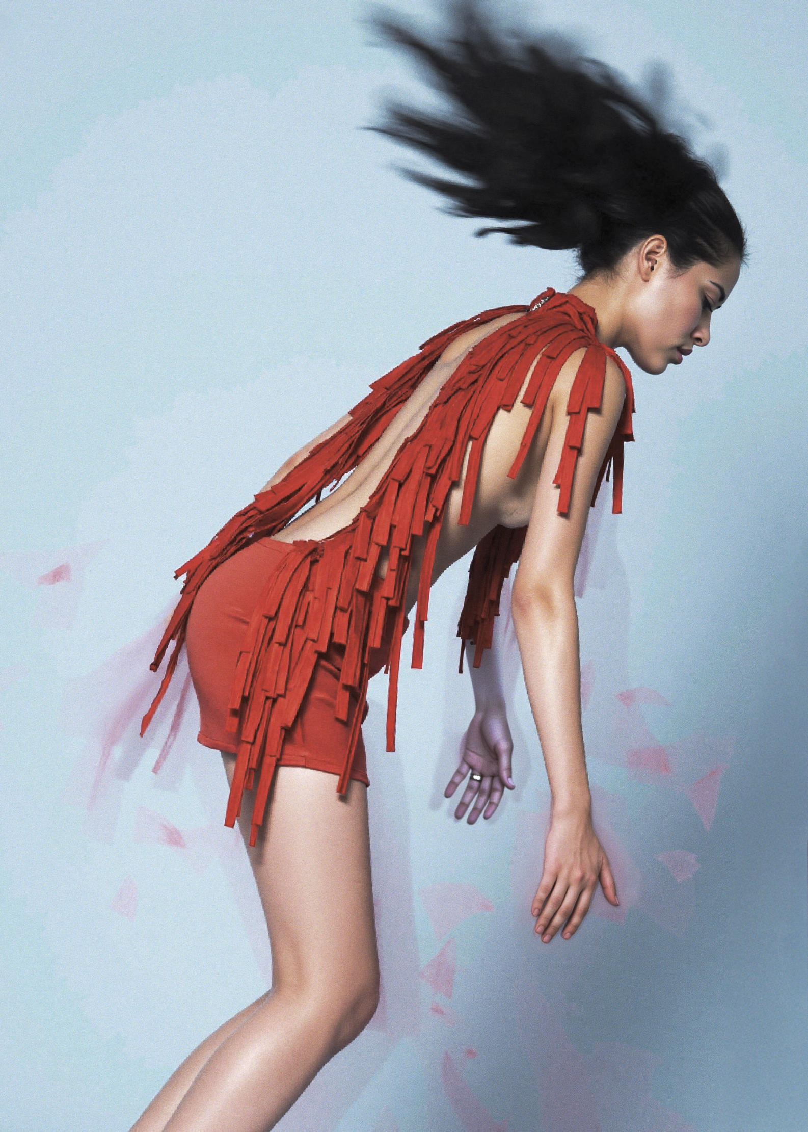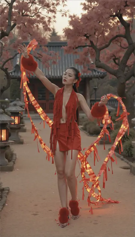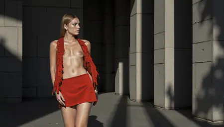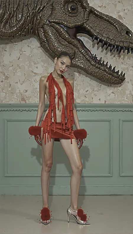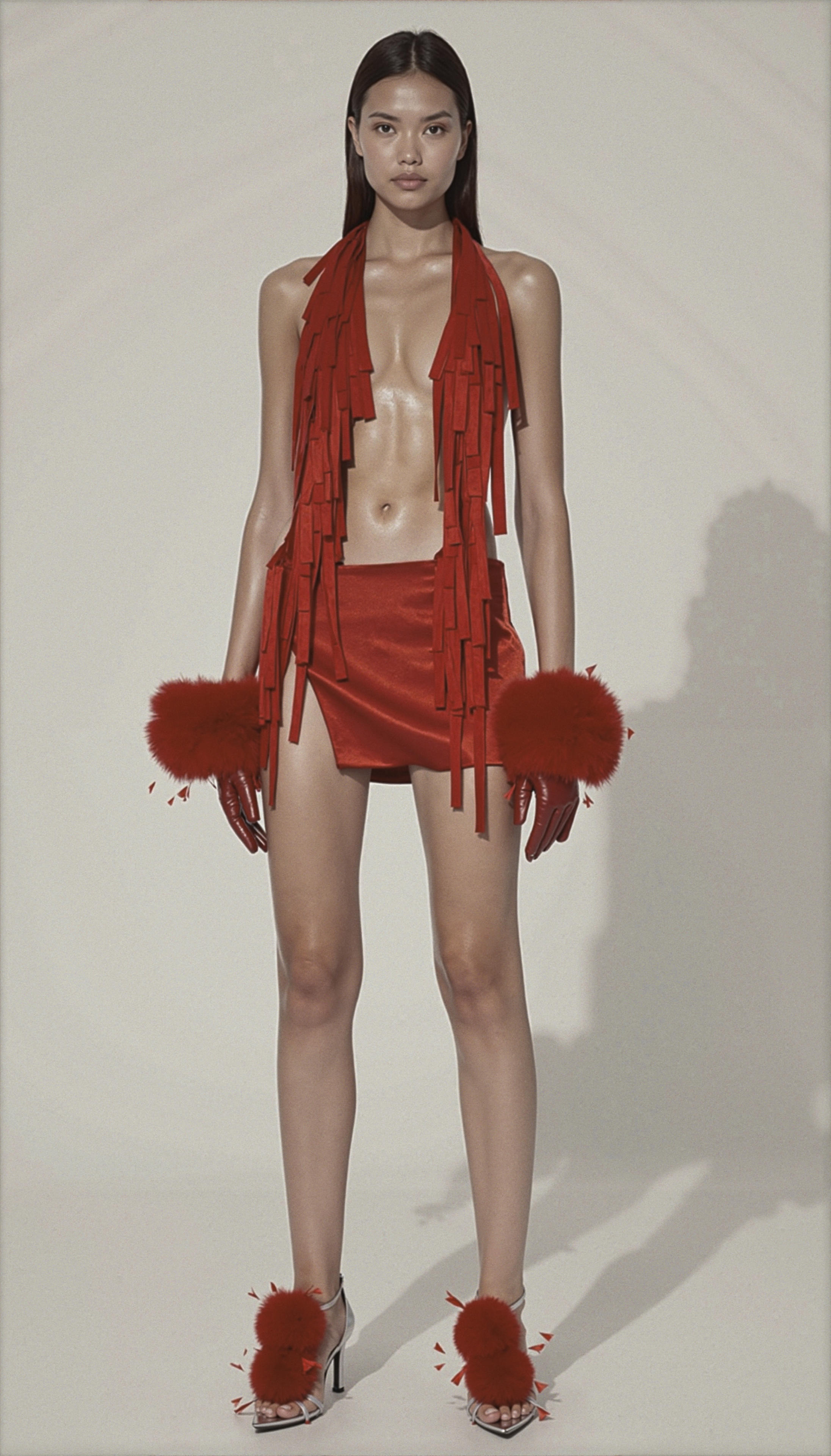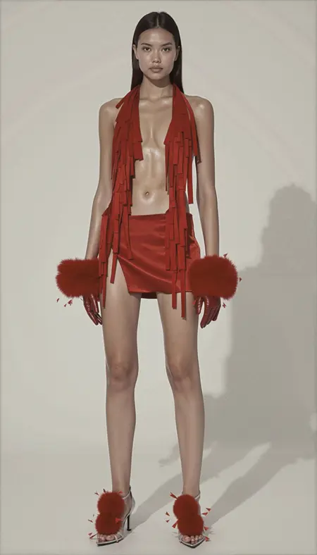 | Trained Words | is wearing a bold, avant-garde outfit predominantly in red. The top features long, fringed elements that drape down, leaving the upper body mostly bare. The lower half consists of a fitted red mini skirt that complements the outfitCopied! |