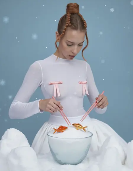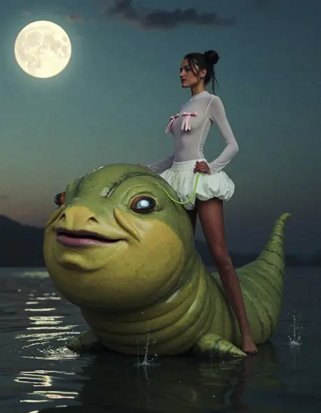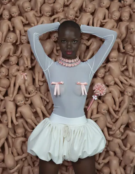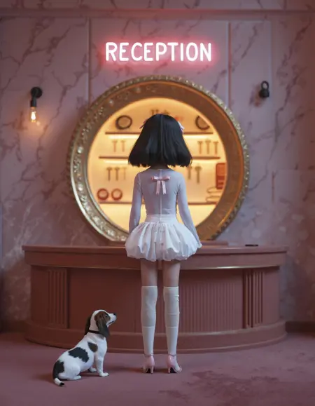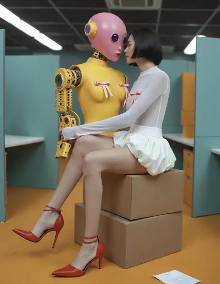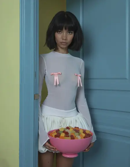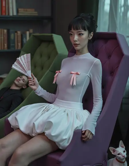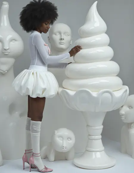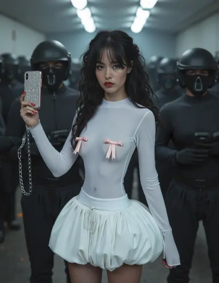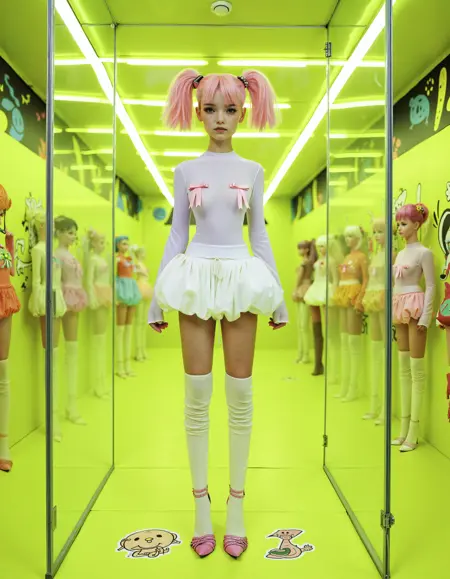 | 训练词汇 | wearing a an outfit consisting of a long-sleeve, sheer white top with pink bows on the chest and a voluminous white mini skirt with an elastic waistband. The look is complemented by knee-high white socks and pink high-heeled shoes with a strap已复制! |