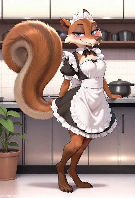 Main prompts: scratte, squirrel, fangs, saber-toothed, blue eyes, fluffy tail, red-brown fur