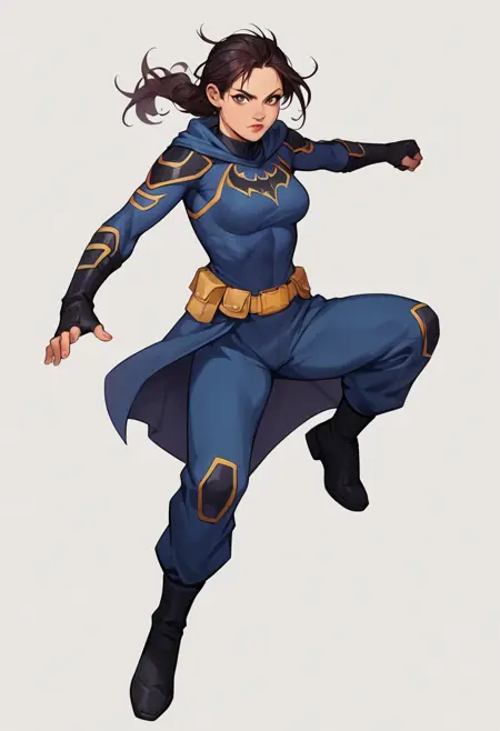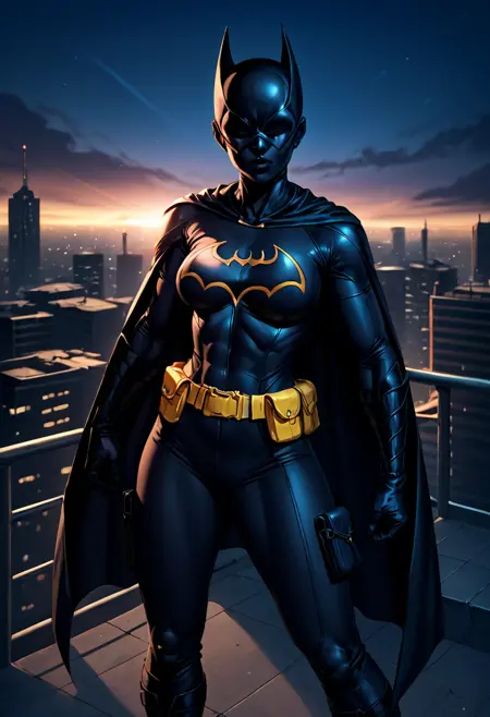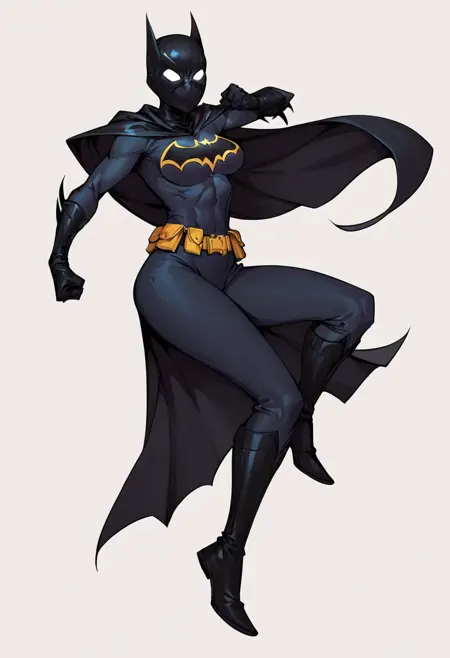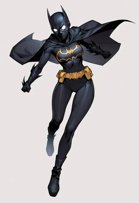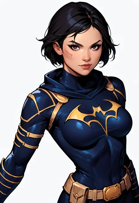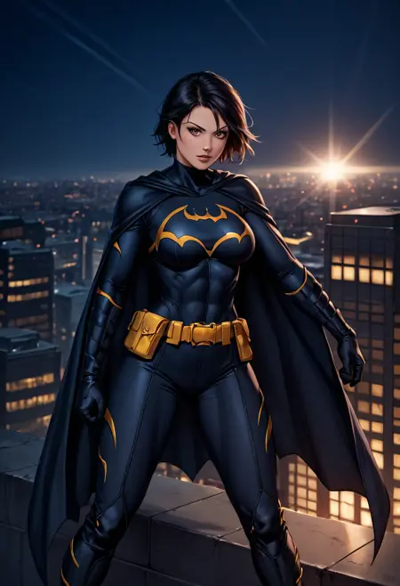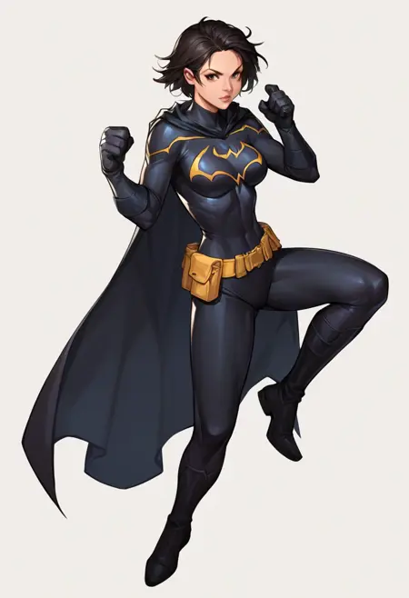 Prompt: cassandra-wayne, asian, chinese, black hair, short hair, BlackBat-outfit, domino mask, black cape, bandages, utility belt