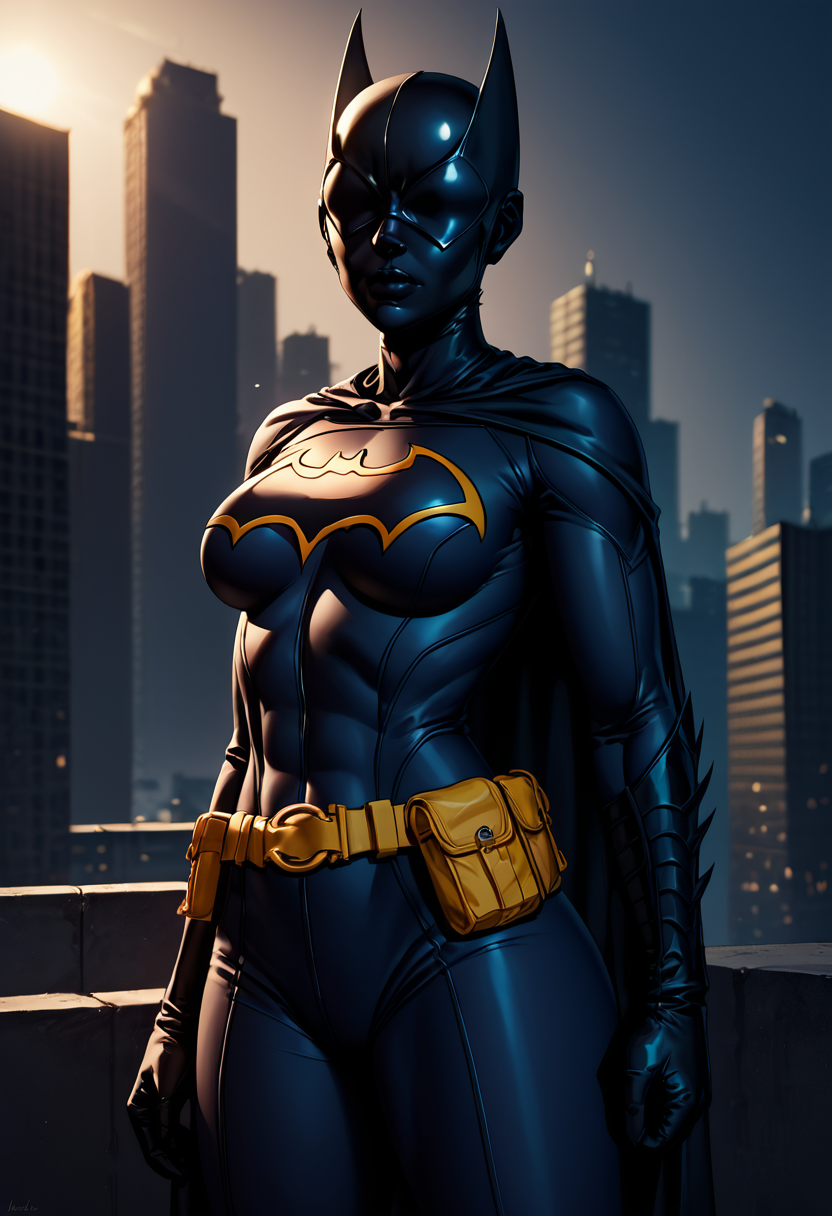 Prompt: cassandra-wayne, asian, chinese, Batgirl-outfit, black cape, mask, batcowl, utility belt, mouth mask, (mask covers eyes), bald
