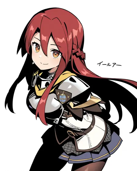 raquna sheldon, 1girl, solo, 붉은 머리, 긴 머리, 눈 사이의 머리, 갈색 눈, 갑옷, 어깨 갑옷, 가슴 갑옷, 팬티스타킹, 치마