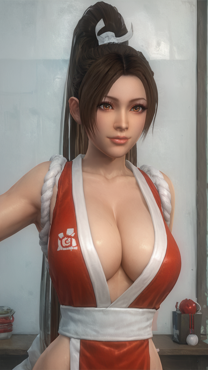 maishiranuidoa5lr, maioutfit, breasts, huge breasts, sideboob, cleavage, 1girl, solo, long hair, high ponytail, looking at viewer...... lora:maishiranuidoa5lrPONYXL:0.7