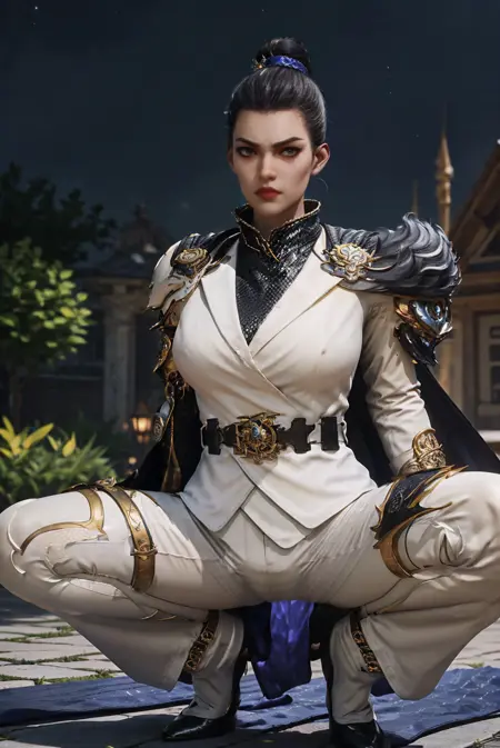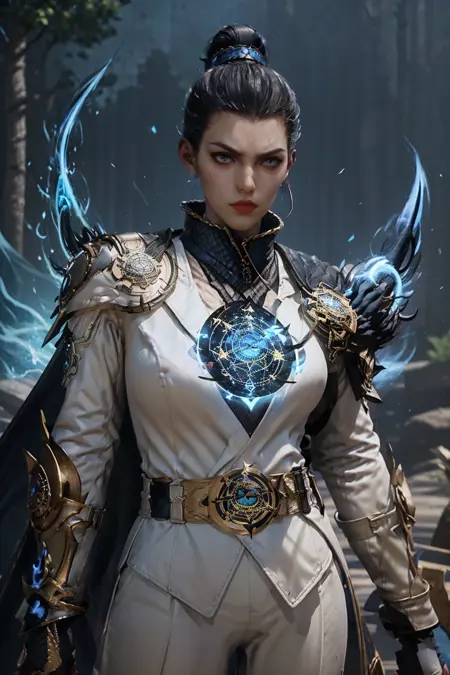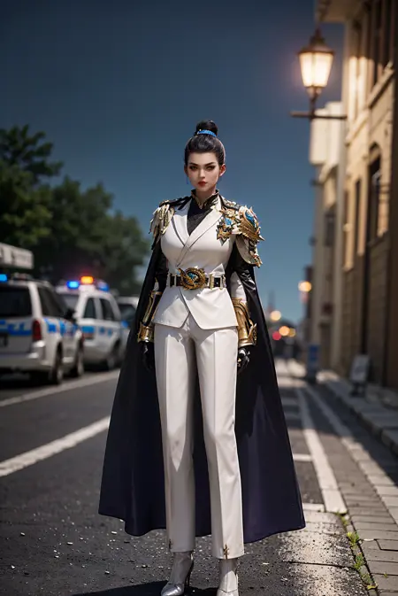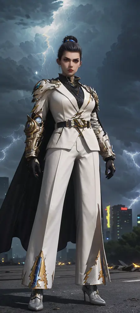 服装提示词: hair ornament, jewelry, suit, long sleeves, cape, chainmail, (armor:1.2), (arm armor:1.2), shoulder armor, gloves, plume, belt, pants, nylon socks, high heels