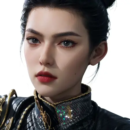 提示词参考: 1girl, solo, black hair, single hair bun, forehead, red lips