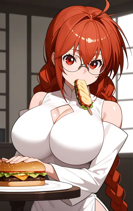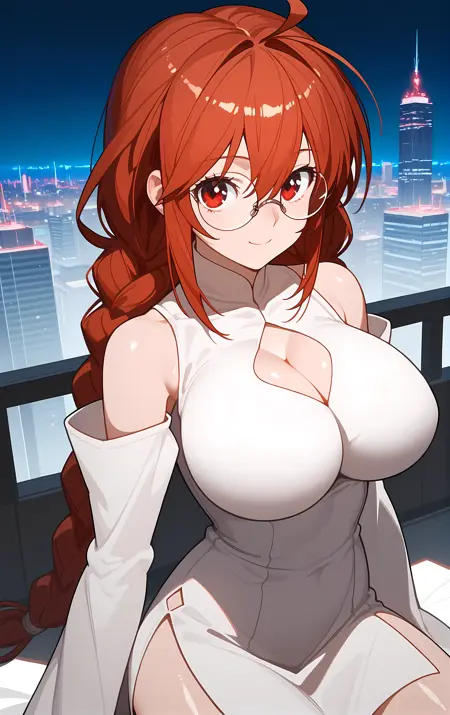 Appearance → ohwx, 1girl, solo, breasts, glasses, braid, red_eyes, large_breasts, red_hair, single_braid, twin_braids, long_hair, very_long_hair, ahoge,