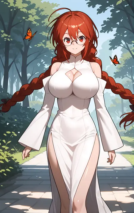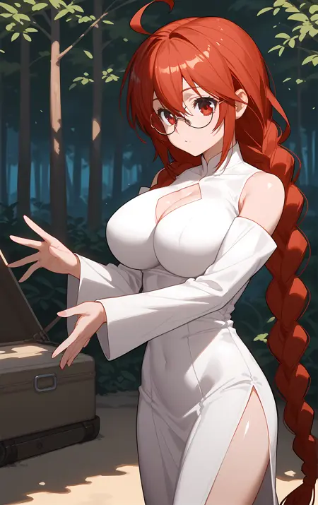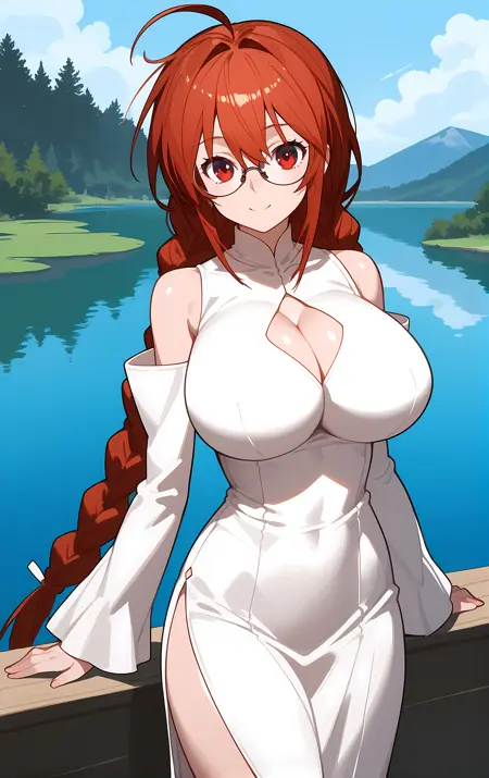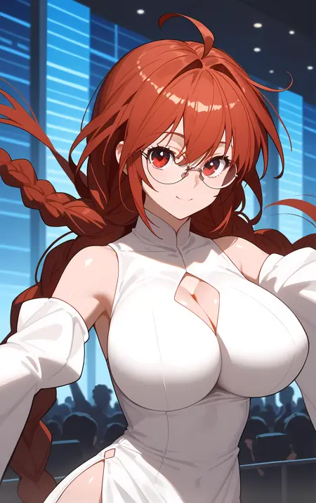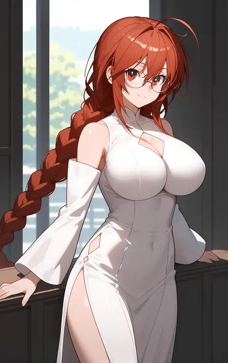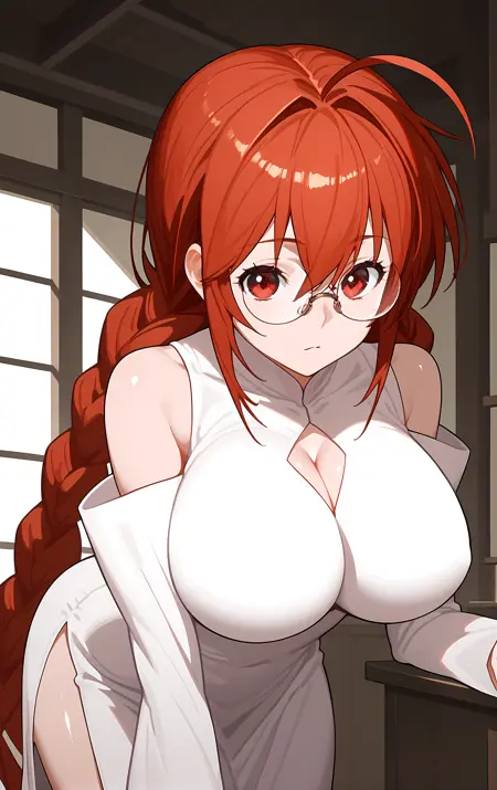 外見 → ohwx, 1girl, solo, breasts, glasses, braid, red_eyes, large_breasts, red_hair, single_braid, twin_braids, long_hair, very_long_hair, ahoge,