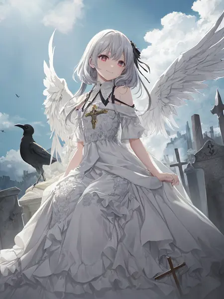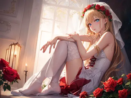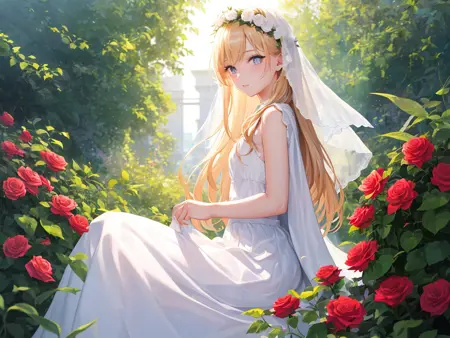 可以使用(8k, RAW photo, best quality, masterpiece:1.2), (realistic, photo-realistic:1.37),omertosa,1girl,(Kpop idol), (aegyo sal:1)best quality, ultra high res, (photorealistic:1.4), (1woman:1.5),(best quality)),((illustration)),((beautiful detailed eyes)),((extremely detailed CG unity 8k wallpaper)),((art of light novel)),from side below,fish-eye shot,In the sea of flowers,[dusk:0.6|stars:0.4],sunset,(1girl:1.5),blond long hair,gary pupils,wear a wreath,white veil,red roses adorn the skirt,white gauze short cloak,long dress,white silk stockings,{young girl},rose headdress,sitting,{{masterpiece}},hang head,Hold a bunch of white rose,lowered eyebrows,small,(1girl:1.5),
