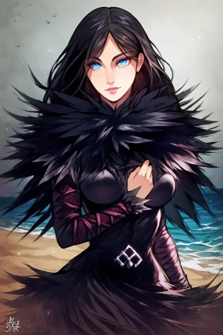 프롬프트: yuria the witch, blue eyes, long hair, black hair, witch hat, witch, cross-laced sleeves, black dress