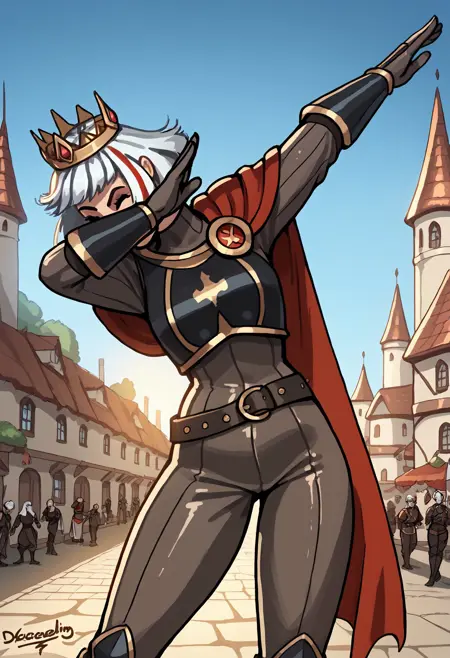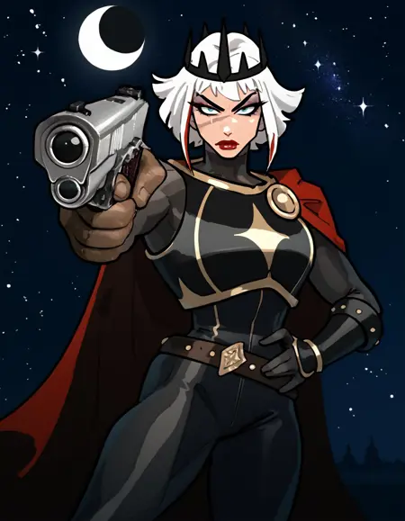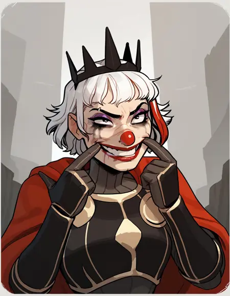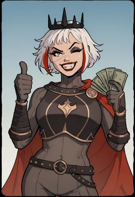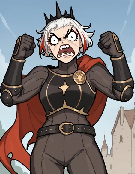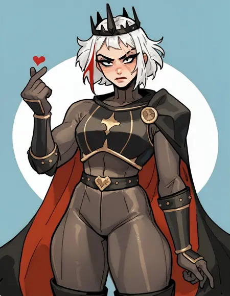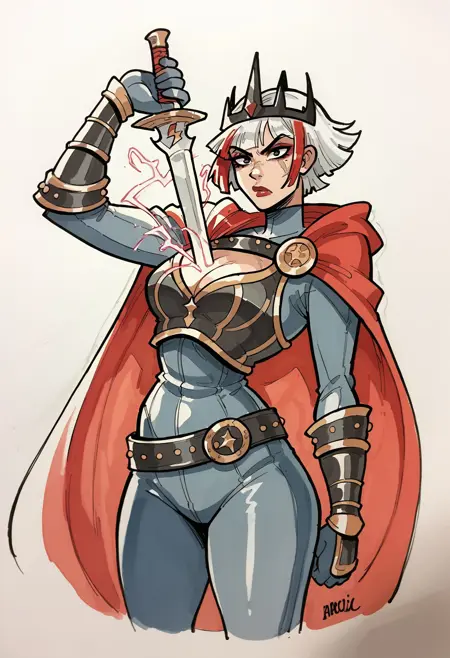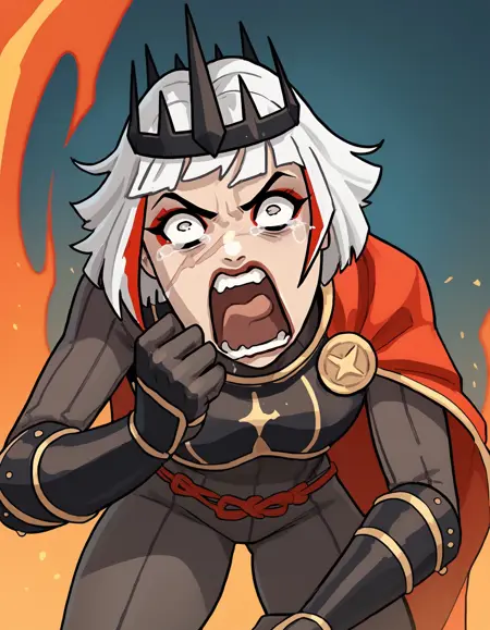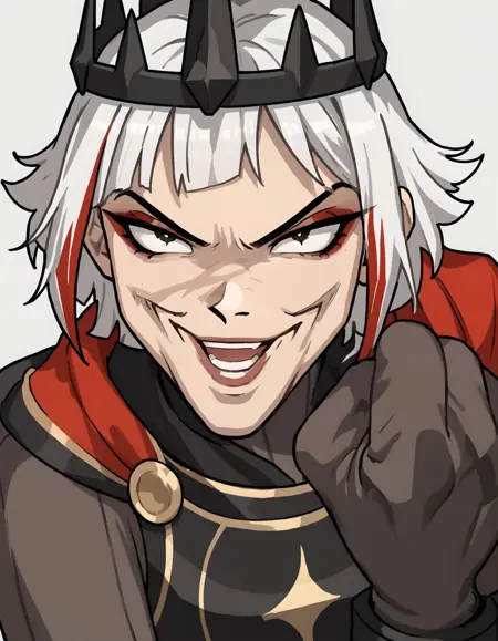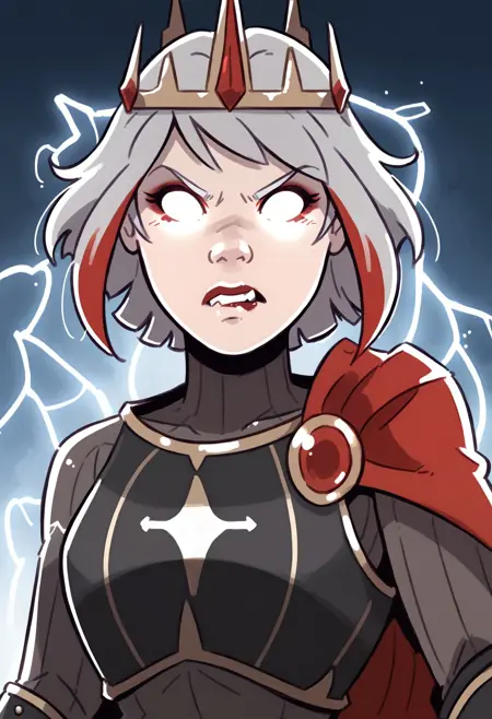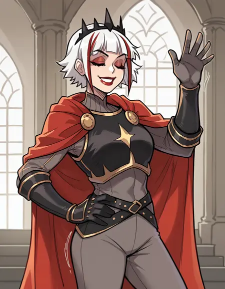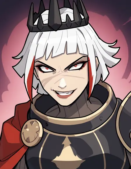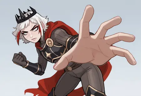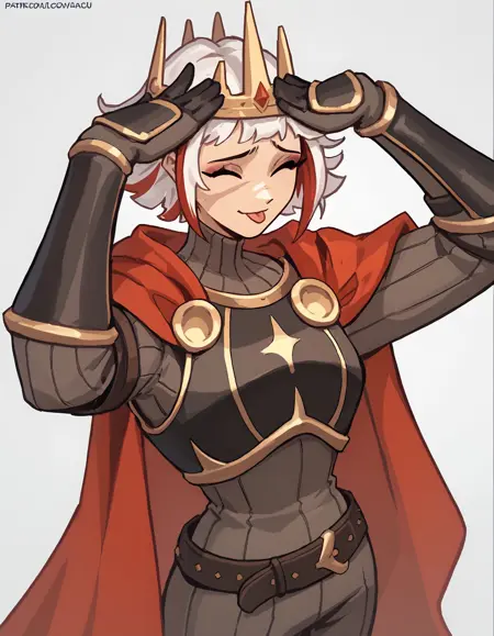 主な外見:短髪、白髪、多色髪、 crown、ボディスーツ、手袋、腕当て、鎧、マント、ベルト、傷、メイク