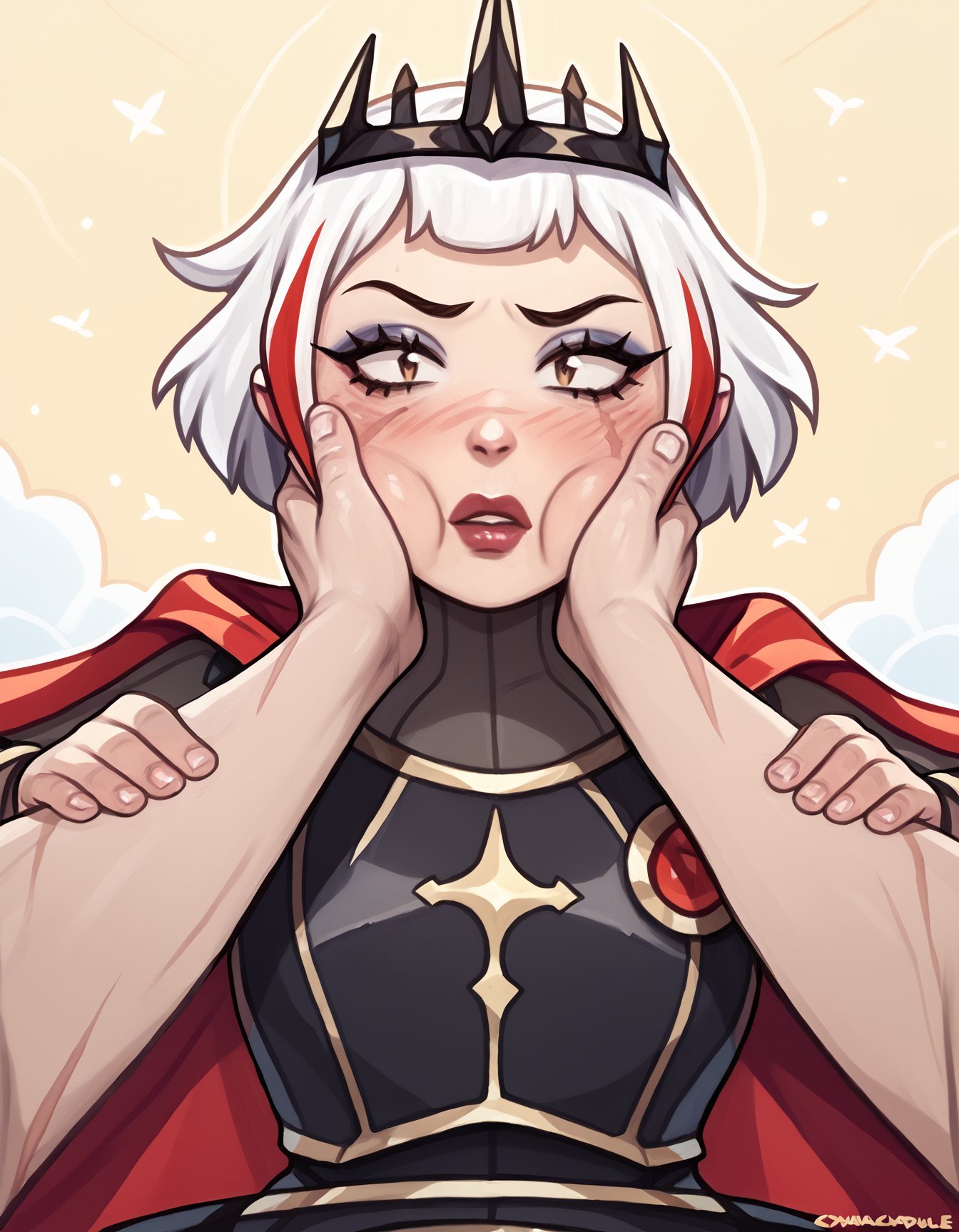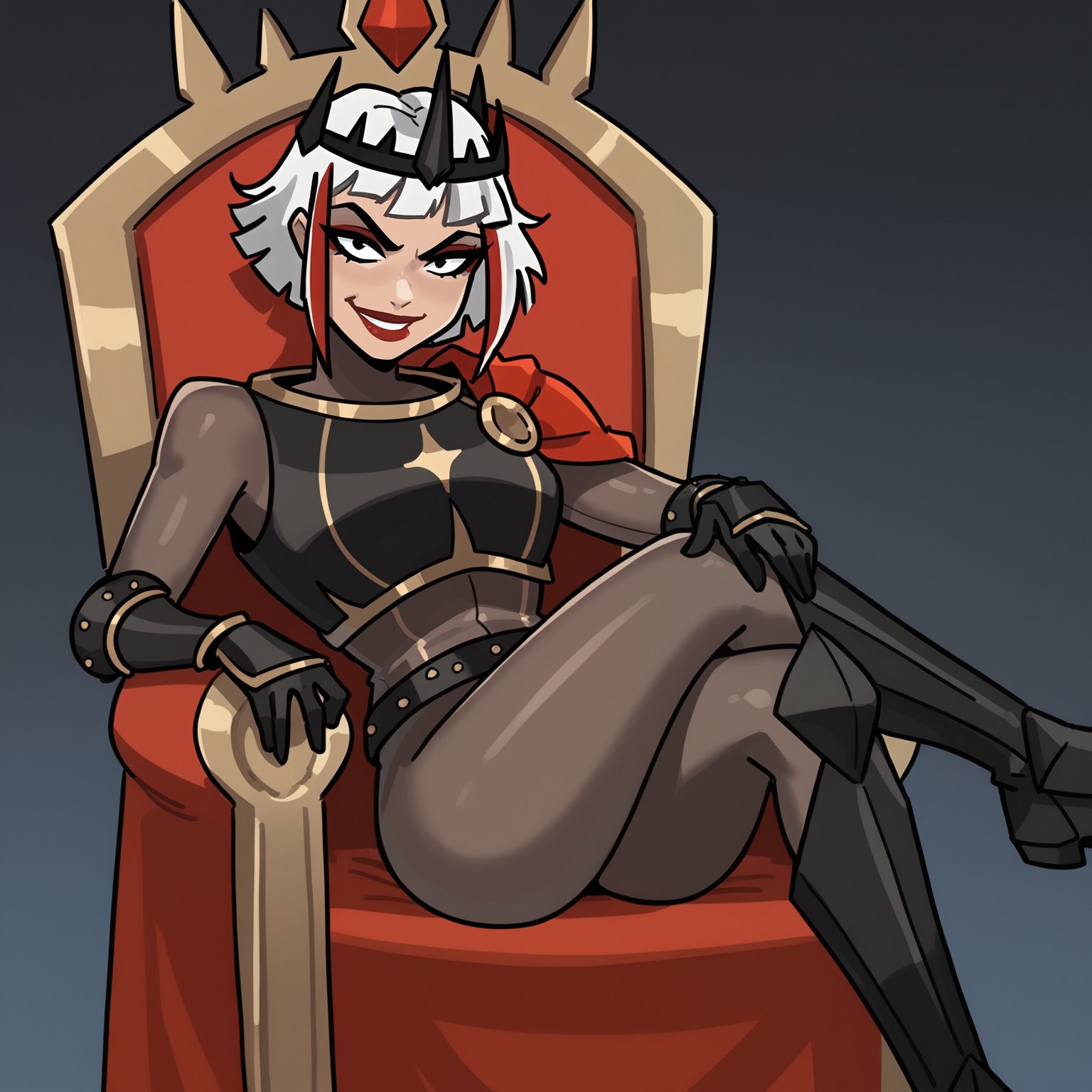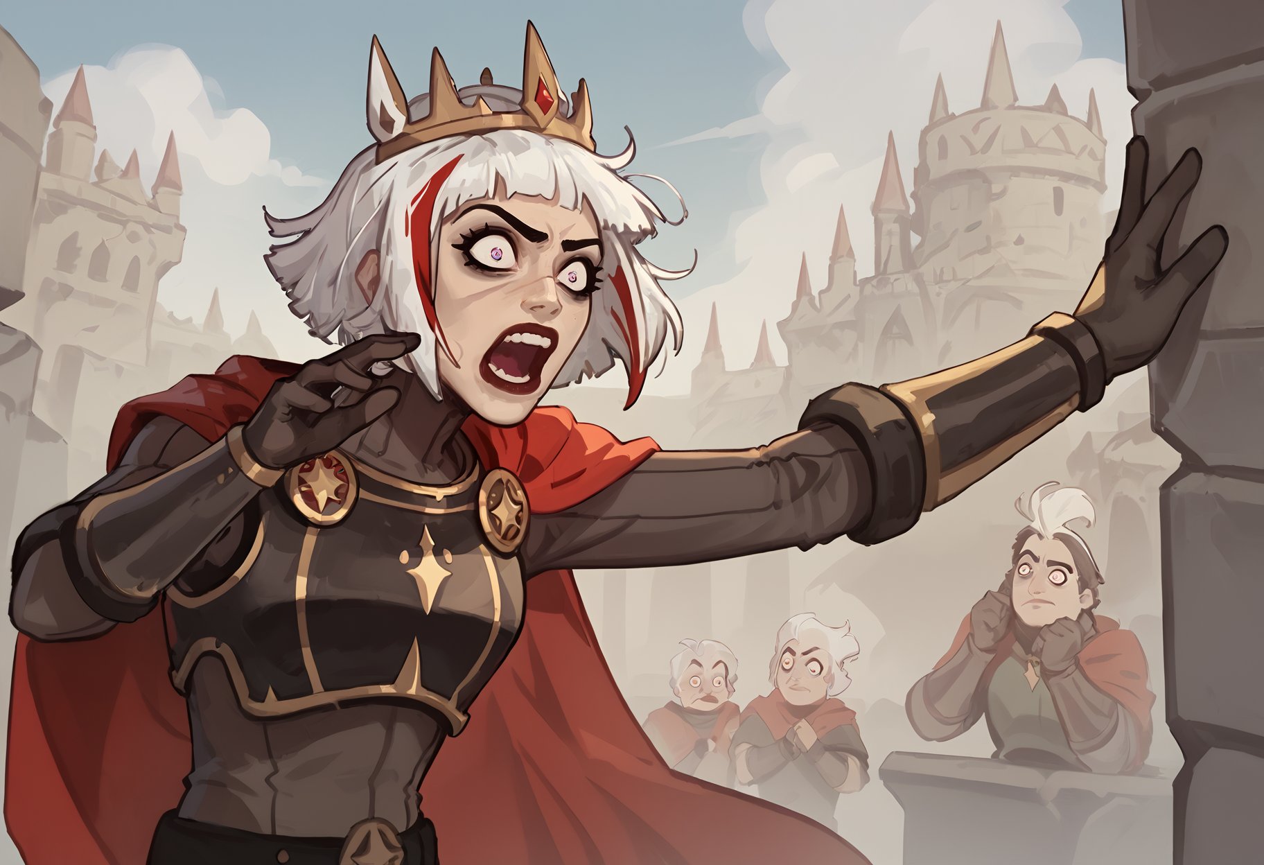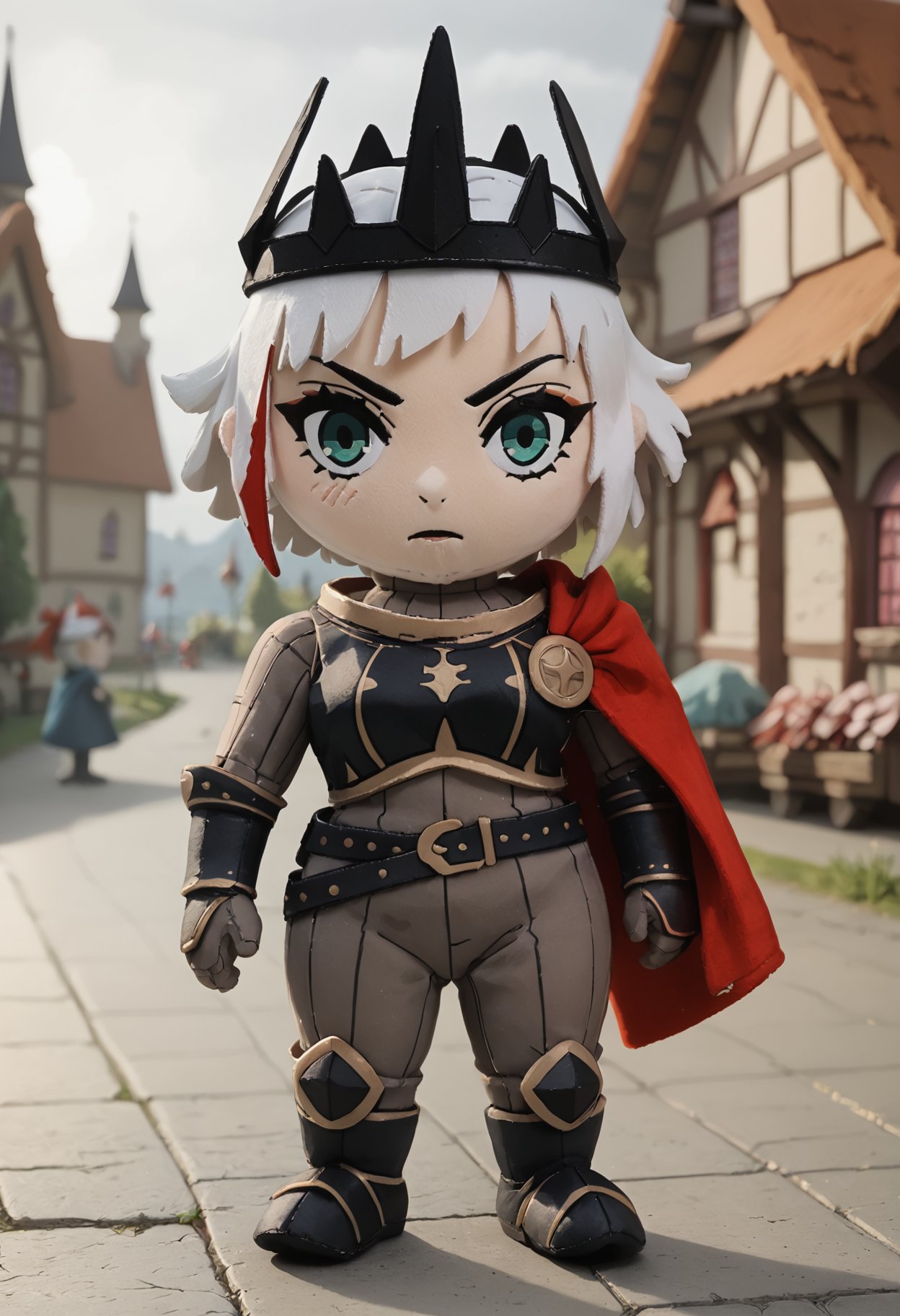 主な外見:短髪、白髪、多色髪、 crown、ボディスーツ、手袋、腕当て、鎧、マント、ベルト、傷、メイク