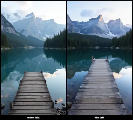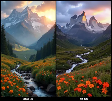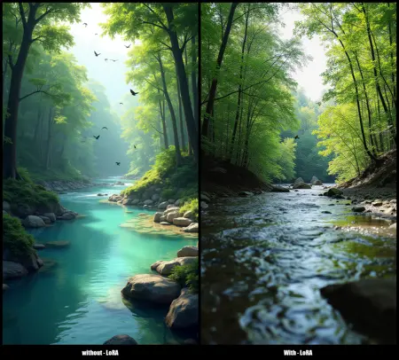 细致的景物:该模型经过训练,能够捕捉山脉、湖泊、河流、森林和天空等自然景观的细节。模型对每个景观元素都进行了充分适应,能够呈现逼真的纹理,如流动的水、随风摇曳的树叶,或阳光穿透薄雾的效果。