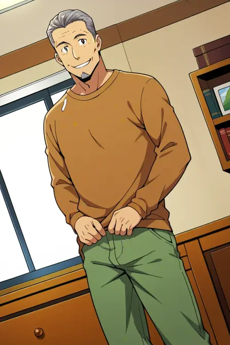 SSDaisakui_outfit02, (brown half buttoned sweater, collarless sweater, sleeves rolled up, untucked clothing), grey sweatpants,