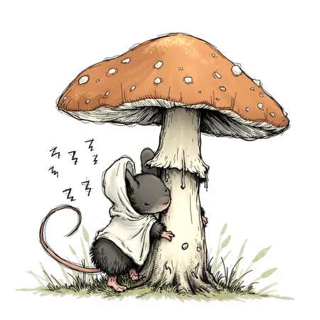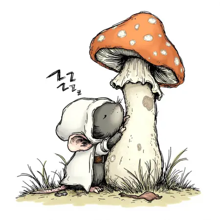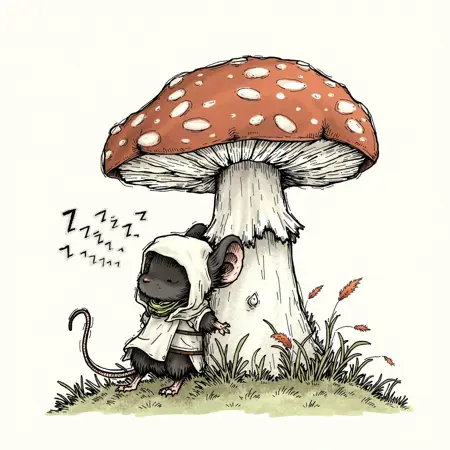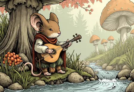Storybook illustration style with fine line work, muted earthy tones, detailed textures, stylized characters, and soft atmospheric shading, a female brown mouseguard mouse, dressed as a bard in a tunic and cape, playing a lute made from a tiny gourd, leaning against a towering toadstool beside a bubbling brook, with a small satchel of berries at their side.