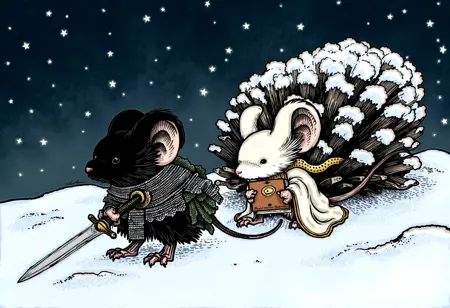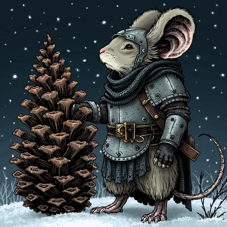 Hand drawn illustration of a dark grey mouseguard mouse, snow storm background, wearing chainmail armor, standing next to a giant pine cone