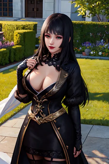 Gentiana, mature female, black hair, hime cut, blunt bangs, lipstick, makeup, black eyeshadow, eyelashes,
